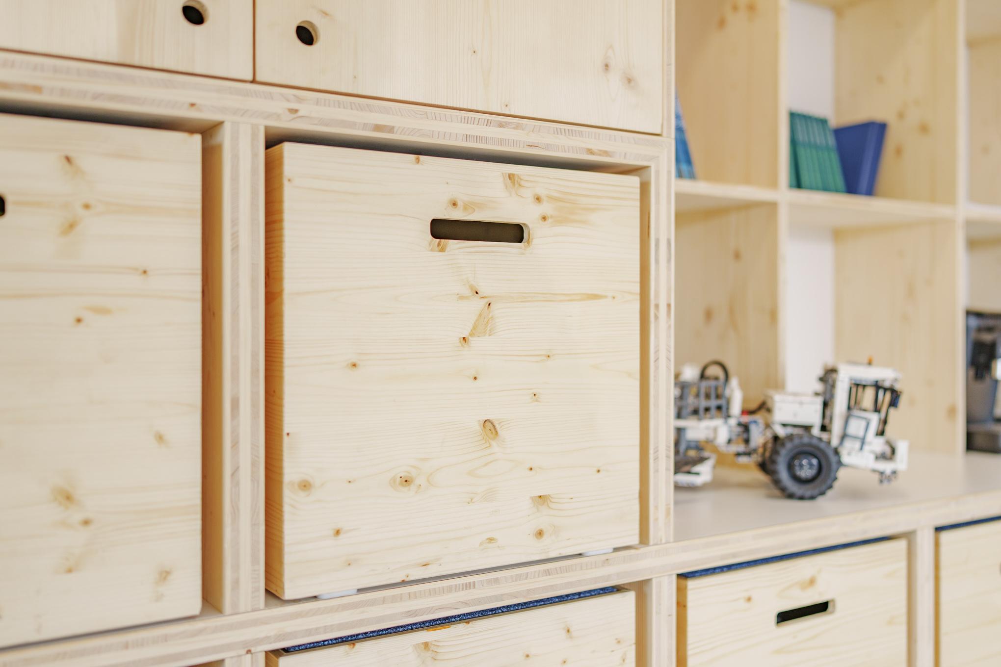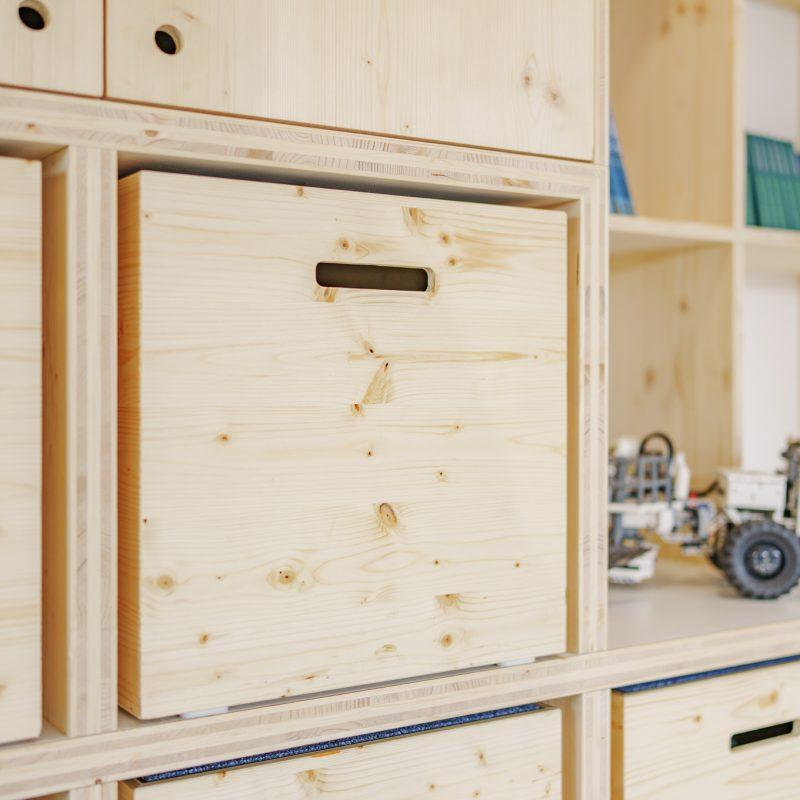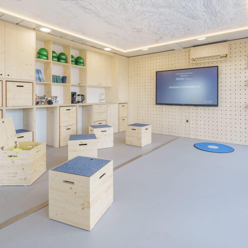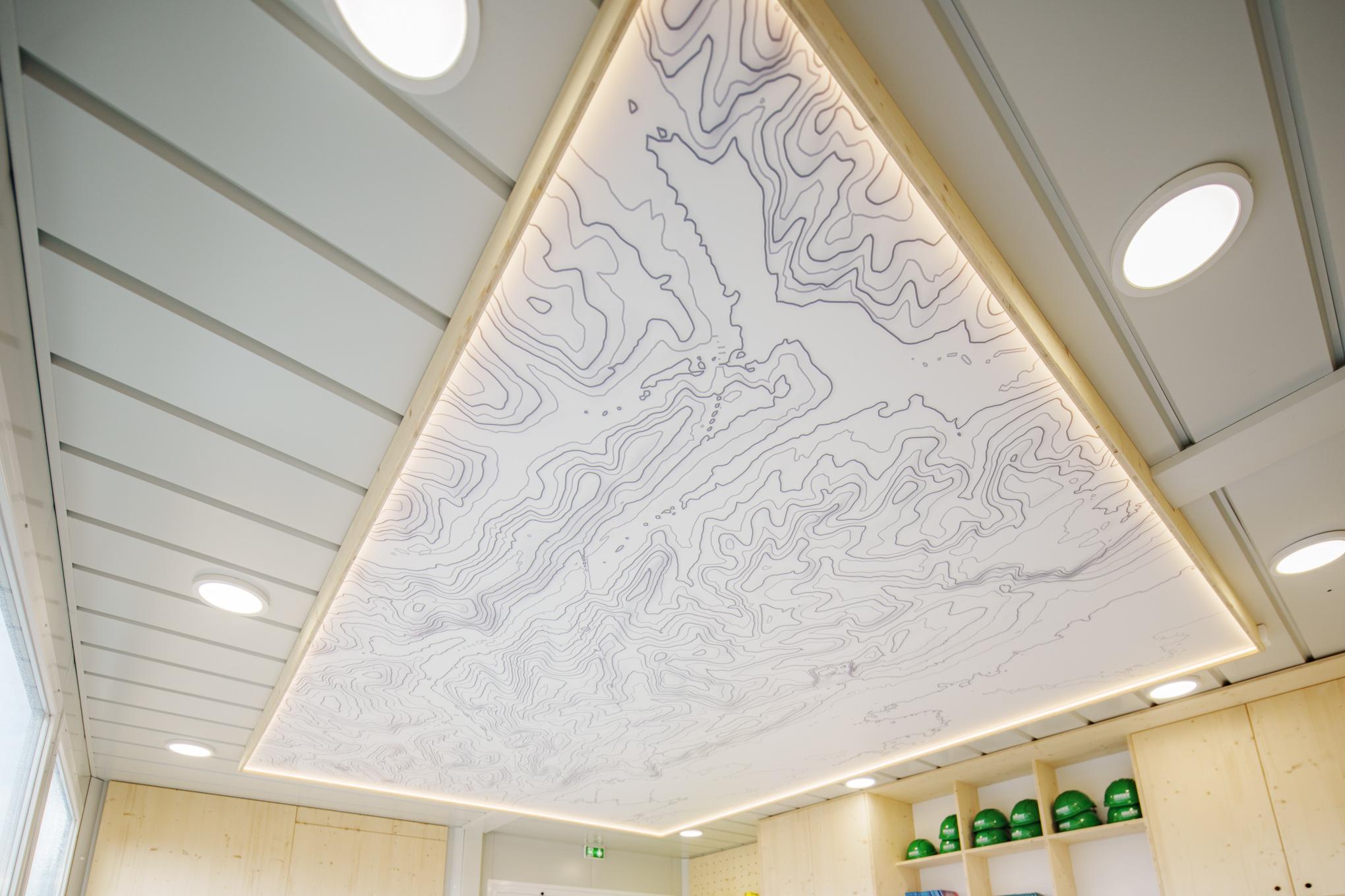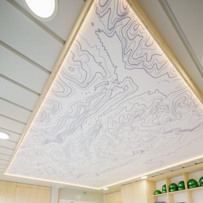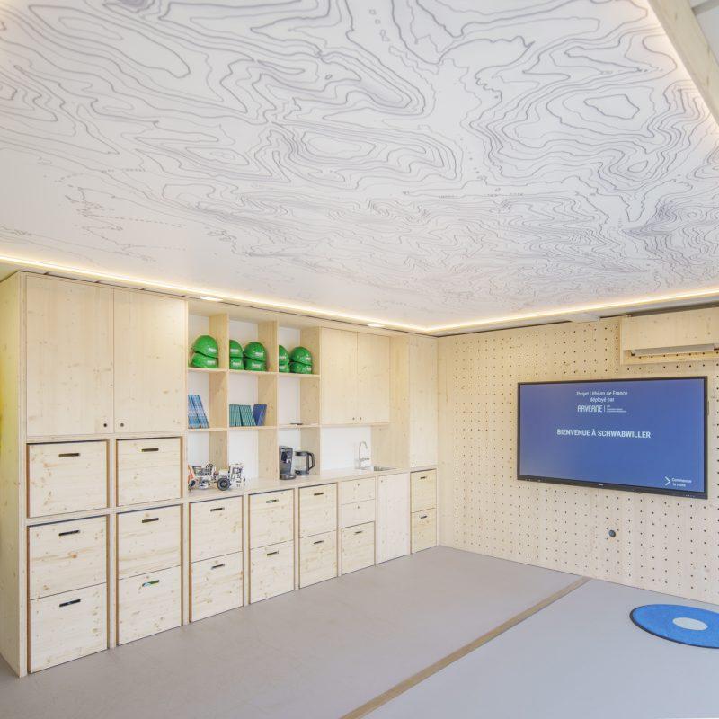 Parmi les éléments marquants, on retrouve un plafond tendu rétroéclairé, encadré de bois, reprenant les lignes topographiques de la région de Schwabwiller. Cette signature visuelle ancre le projet dans son territoire et apporte une ambiance chaleureuse à l’espace.