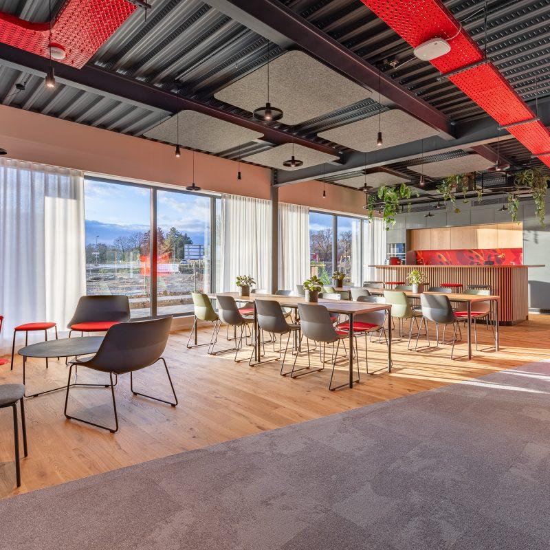 Tout en respectant les visuels 3D fournis par ABCD architecture, nous avons ajouté notre touche personnelle en réalisant des murs décoratifs, en posant de la moquette dans les bureaux et du parquet massif dans le réfectoire, créant ainsi une ambiance industrielle mettant en valeur des réseaux apparents et un plancher collaborant thermolaqué aux couleurs de WÜRTH.
